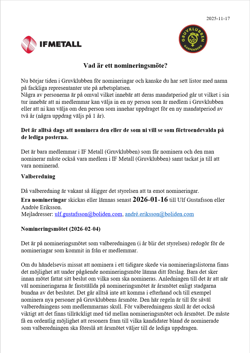 I torsdags hade centrala parter (IFM Och Industriarbetsgivarna) förhandling om den tvist vi avslutade i oenighet på företagsnivå. Parterna kom fram till att ajournera förhandlingen och ge de lokala parterna (AOG & klubbarna i Aitik, Boliden, Kristinenerg & Garpenberg) i uppgift att "Gemensamt" utvärdera testet om 3 slopade karensdagar/person/år.